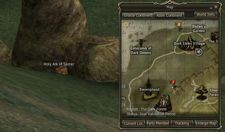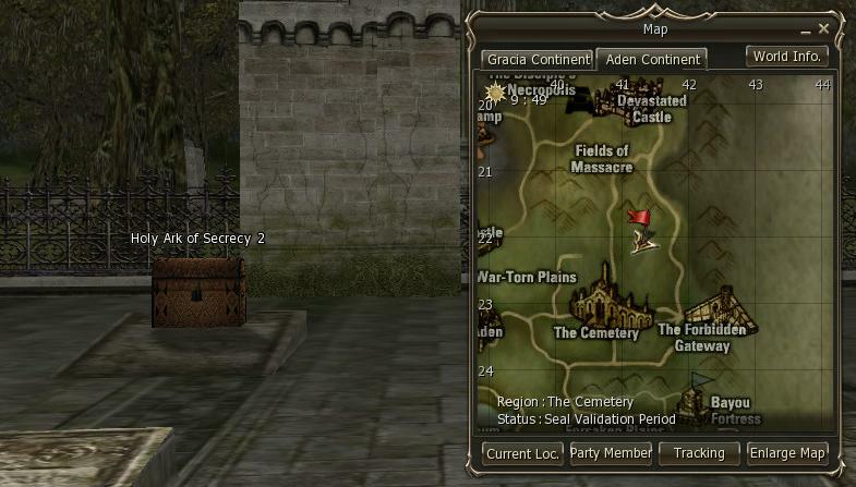 4.С Aden тп в Seal of Shillien или Forbiden Gateway (смотря какие у вас хроники) и бежим налево на горку, там где респается Cabrio на могильник. Находим там сундук Holy Ark, вообще квест на бая состоит из поиска трех этих сундуков.