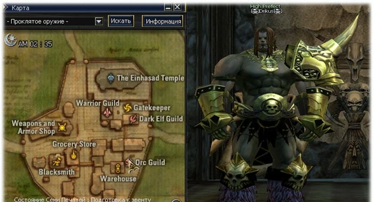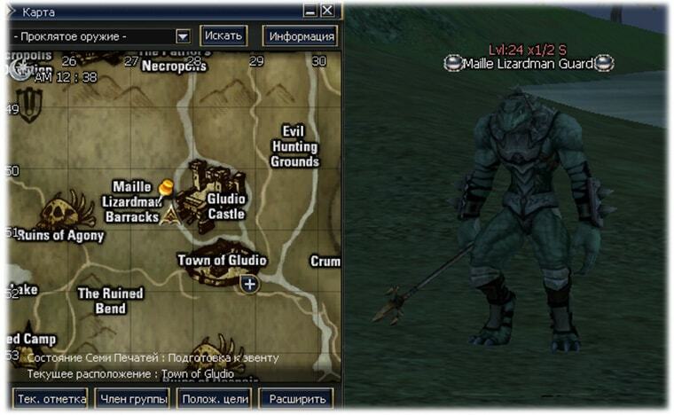 3. Выходим с Глудио через западный выход, бежим прям и немного правее (северо запад) находим ящеров 1/2 HP, фармим, пока не соберем 30 медалек. Возвращаемся к Ланди. Он просит сходить, предать оркам подарок. Идем в гильдию орков в глудио, к главному Drikus, поговорим с ним.