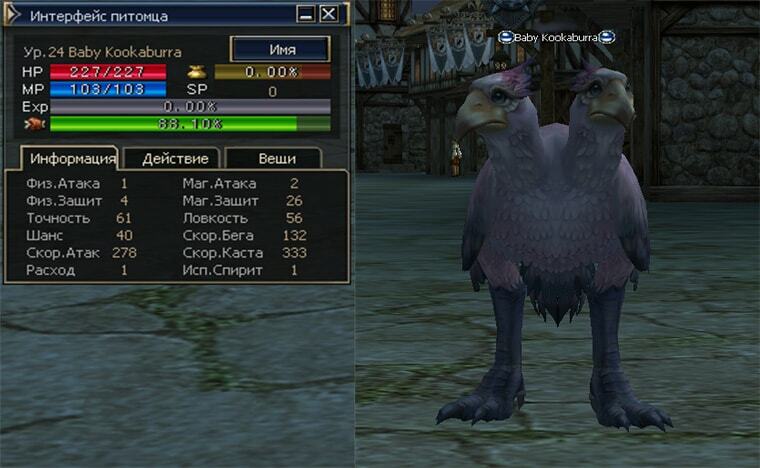 На 55 уровне, уберите все вещи из kookaburra lineage, отзовите ее, подойдите к Pet Manager и выбери пункт "Обменять курицу на улучшенную курицу" и вы получите коричневого бройлера, который будет лить ману и вешать баффы для мага. (Уровень бафов зависит от уровня курицы, после 65 уровня будут максимальные)
